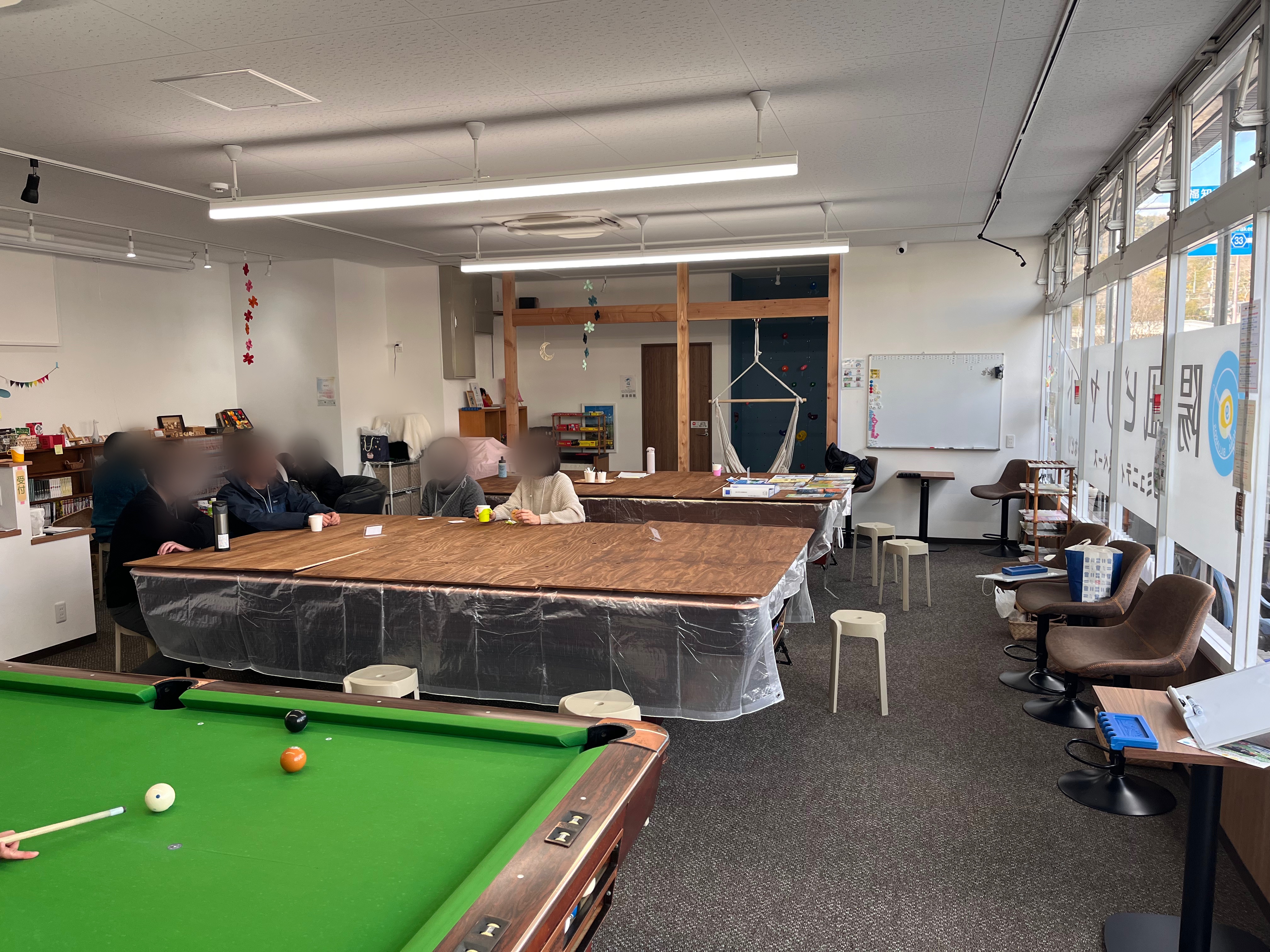 初めての方も2名来てくださりました。 今回はボードゲームのテーブルに座る方がおられず、ビリヤードと支援者交流会に分かれました。
